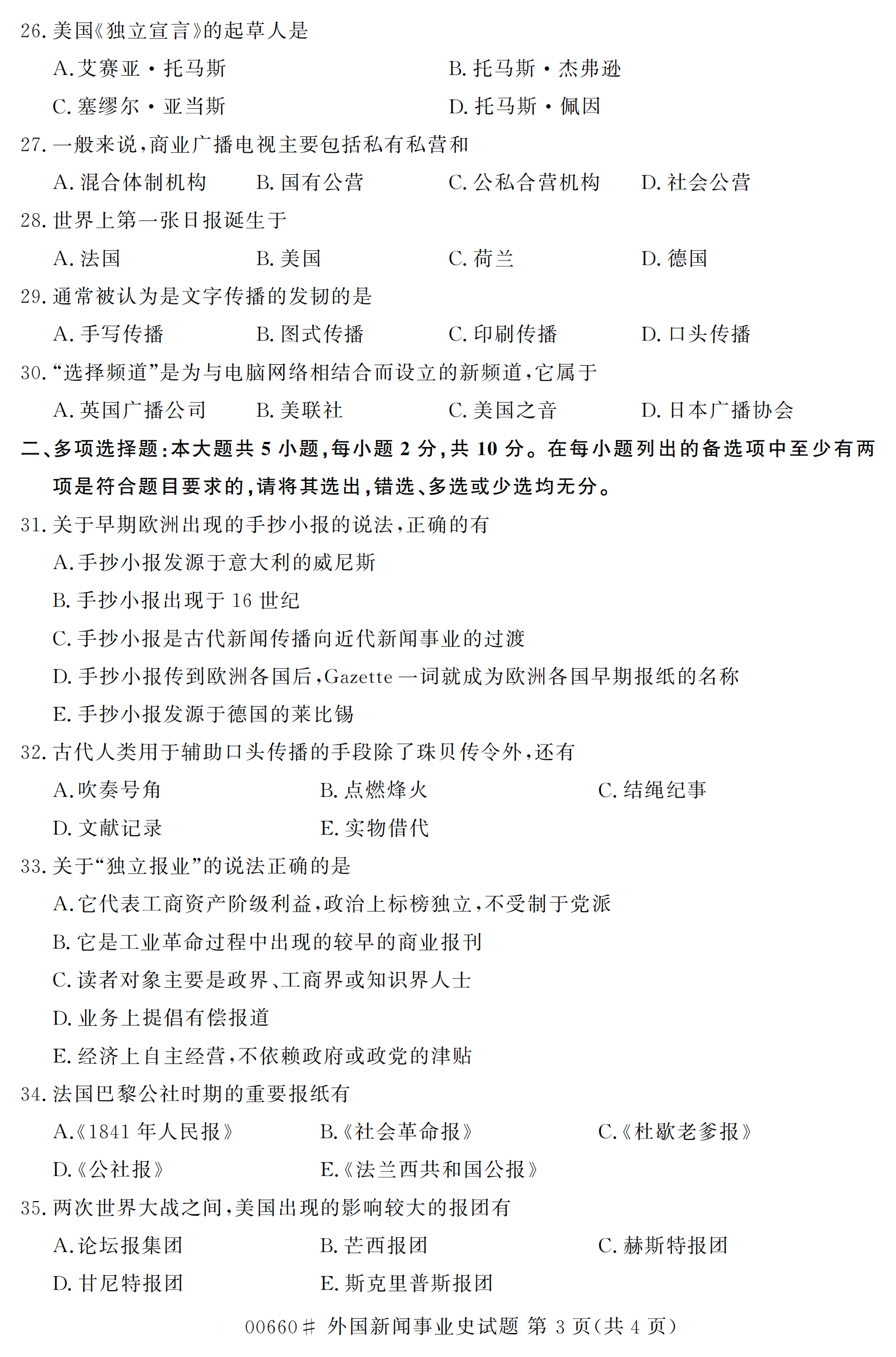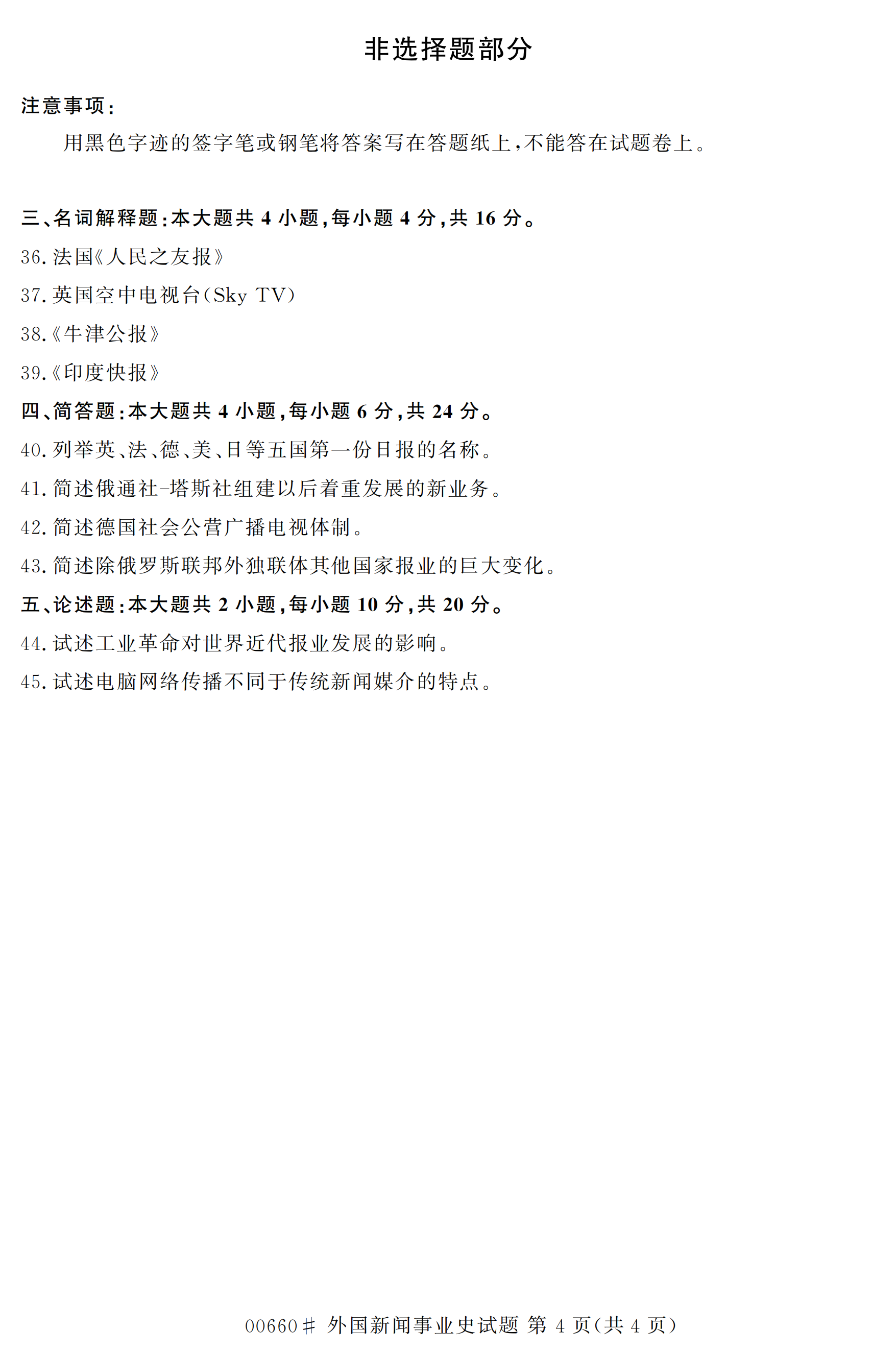 全國(guó)2020年10月自考本科外國(guó)新聞事業(yè)史(00660)試題