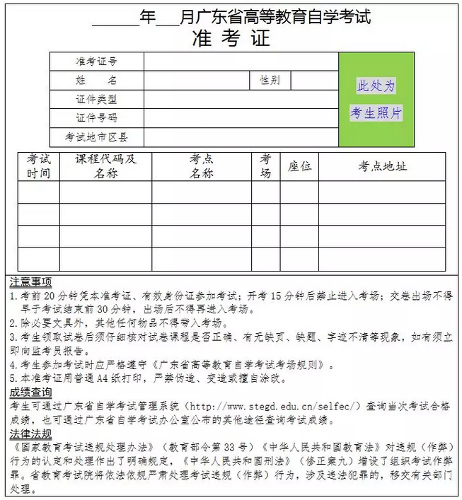 廣東省高等教育自學(xué)考試準(zhǔn)考證參考式樣